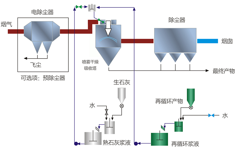 SDA一般使用生石灰(CaO) 作為吸收劑, 生石灰經過消化后制成熟石灰漿液, 旋轉霧化器將吸收劑漿液霧化成億萬個細小霧滴, 高溫煙氣進入吸收塔后, 立即與呈強堿性的吸收劑霧滴接觸, 煙氣中的酸性成分(HCL、HF、SO2 、SO3 ) 被吸收, 同時霧滴的水分被蒸發,變成干燥的脫酸產物。